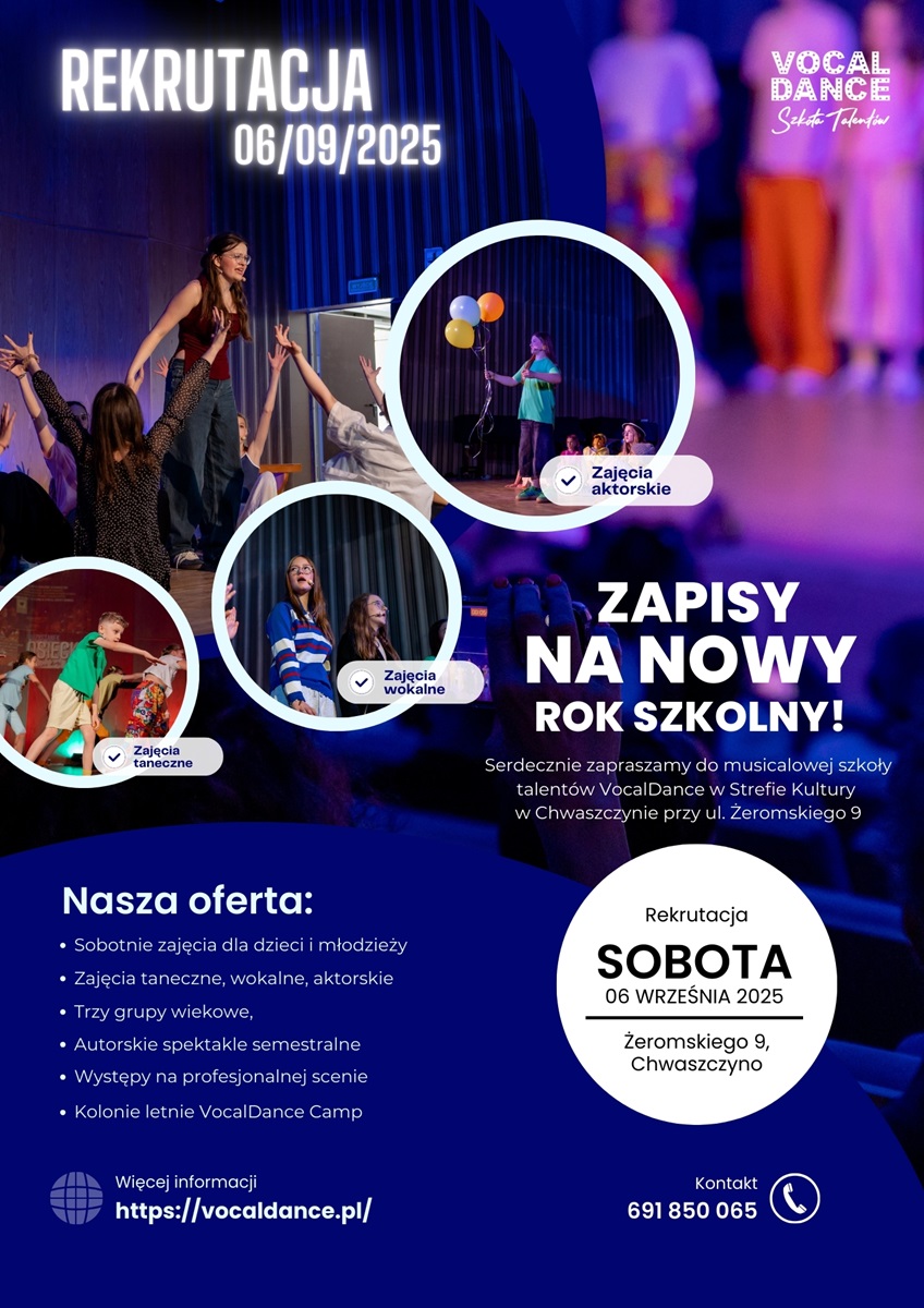 Zapraszamy na przesłuchania cały rok, a już 6 września zapraszamy dzieci na pierwsze zajęcia, podczas których będzie można przekonać się, że warto dołączyć do naszej szkoły. W razie pytań i wątpliwości zachęcamy do kontaktu przez e-mail szkoły oraz pod numer telefonu; 691 850 065 ( Właściciel szkoły Karolina Klawitter), 691 125 636 (Kierownik artystyczny szkoły Katarzyna Witkowska). Nasze e-maile: vocaldancecamp@gmail.com oraz impresariat.eduart@wp.pl